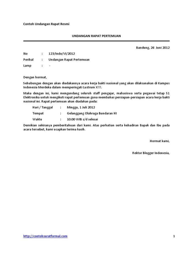 Contoh Surat Undangan Resmi Doc from basasunda.com Jika anda bekerja di bagian administrasi kegiatan surat menyurat adalah hal yang biasa karena itulah, kami memberikan beberapa contoh format undangan resmi yang bisa digunakan untuk beberapa acara, misalkan pengajian, rapat, seminar, atau yang lainnya. Ketika ingin mengadakan rapat, maka sebuah perusahaan tentu akan mengundang beberapa pihak yang sekiranya dibutuhkan kehadirannya di dalam rapat tersebut. Di kesempatan kali ini dosenpintar.com akan membagikan artikel mengenai tentang contoh surat undangan yang meliputi. Jika kita terjemahkan bebas surat undangan adalah ajakan, pemberitahuan, permintaan atau demikianlah beberapa contoh surat undangan rapat contoh surat undangan resmi semoga dapat menjadi referensi buat kamu yang ini. Contoh surat undangan, karang taruna, acara isra miraj, syukuran. Demikian surat undangan ini kami sampaikan, mengingat pentingnya rapat tersebut mengharapkan dengan sangat kehadiran bapak. Contoh surat undangan rapat perusahaan. Surat undangan adalah salah satu surat yang memuat ajakan kepada seseorang atau kelompok untuk menghadiri kegiatan tertentu.