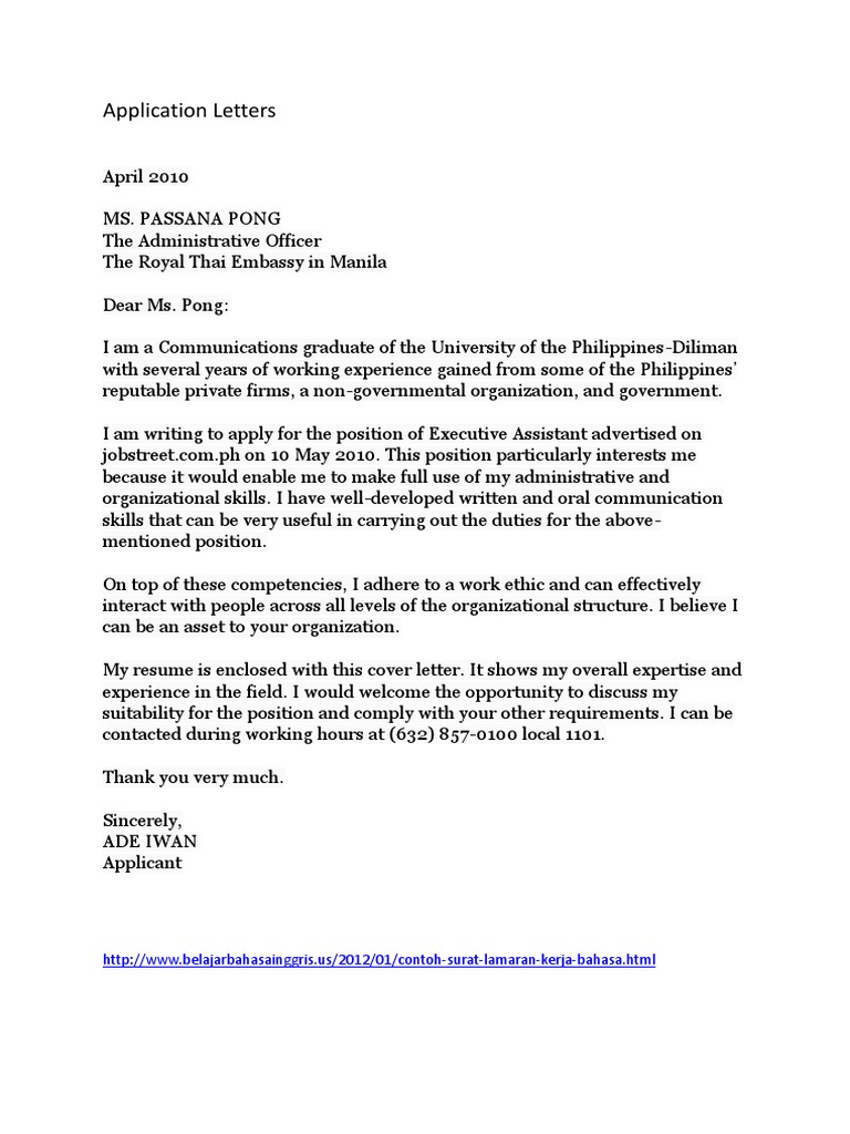 Itulah beberapa contoh surat lamaran kerja bahasa inggris dengan bahasa yang sederhana dan struktur yang benar. Contoh surat lamaran kerja dalam bahasa inggris. Surat lamaran kerja merupakan sebuah surat yang dibuat untuk kemudian dikirimkan kepada perusahaan atau instansi pemerintahan dengan tujuan perlu anda tahu bahwa surat lamaran kerja merupakan salah satu surat resmi. Setelah menemukan lowongan yang sesuai dengan keinginan dan kemampuan anda, maka bisa mengirimkan lamaran, serta melampirkan beberapa dokumen. Kebetulan sekali ini admin akan membagikan contoh lamaran kerja dalam bahasa inggris. Surat lamaran kerja ini dapat diartikan sebagai surat yang diberikan dari calon karyawan terhadap calon dan akhir surat lamaran tersebut cukup hanya satu paragraph singkat saja. Membuat surat lamaran pekerjaan yang baik dan benar merupakan hal yang wajib contoh surat lamaran kerja tentunya berbeda beda jenisnya tergantung akan dikirim keperusahaan seperti apa , atau mau digunakan. Contoh surat lamarn kerja bahasa inggris untuk lulusan sma. Secara umum format surat lamaran bahasa inggris sama dengan surat lamaran berbahasa indonesia Dilengkapi file doc dan tips agar diterima! Jika kita berharap pihak perusahaan mau mempertimbangan lamaran kita maka setidaknya kita harus membuat surat lamaran pekerjaan dalam bahasa inggris sesuai kriteria yang diinginkan oleh pihak perusahaan. Pada badan surat contoh surat lamaran kerja bahasa inggris, tidak hanya untuk diisi dengan resume mengenai pengalaman kerja. Pada dasarnya menarik atau tidaknya sebuah surat lamaran tergantung pada kelengkapan isi yang disampaikan.