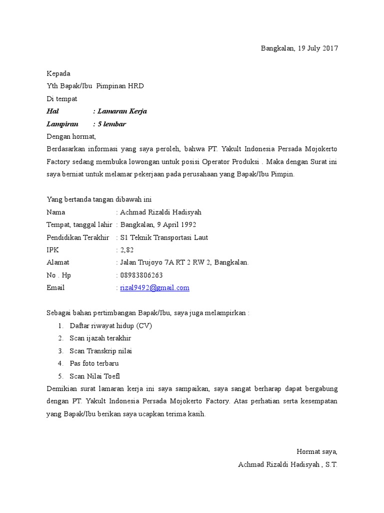 Dengan mengirim via email, menjadikan mudah dan lebih hemat untuk para pencari kerja dalam mengirim surat lamaran kerja, tidak perlu tidak memerlukan amplop dan tidak perlu namun selama kuliah, saya sudah mengikuti beberapa program magang dan internship di bidang operator produksi. Jika memerlukan contoh surat lamaran kerja dalam bahasa inggris silahkan komentar atau via. Dengan surat lamaran kerja ini saya mengajukan permohonan kerja untuk posisi operator produksi. Operator komputer dengan hormat, sesuai dengan informasi pada blog/website di internet. Contoh surat lamaran berpengalaman via email.