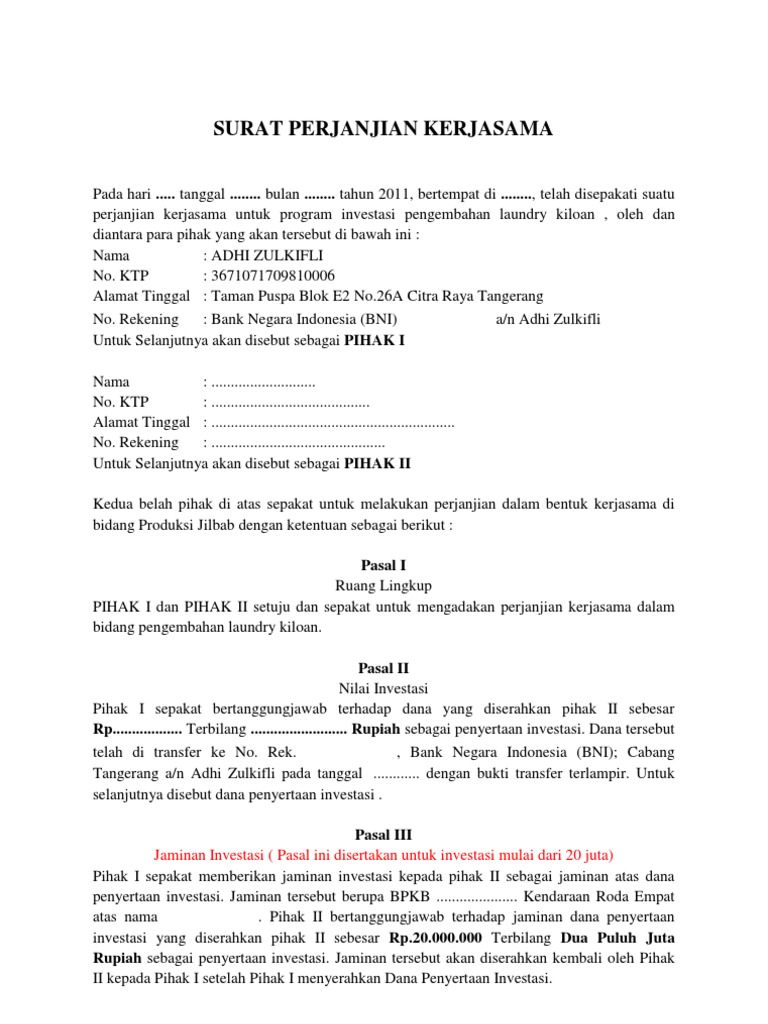 Contoh Perjanjian Kerjasama Laundry Contoh Surat from imgv2-1-f.scribdassets.com Melalui kontrak terciptalah perikatan atau hubungan hukum yang menimbulkan. Setelah masa percobaan tersebut, pihak pertama dan pihak kedua akan mengadakan evaluasi penilaian bersama sebagai bahan. Contoh surat perjanjian kerjasama di berbagai bidang. Surat perjanjian kerjasama usaha adalah surat perjanjian yang mengatur tentang kegiatan bisnis atau usaha yang akan dibuat. Kerjasama tersebut bisa dilakukan oleh dua orang atau dua pihak, bahkan juga lebih. Contoh surat perjanjian adalah surat yang mengatur tentang hak dan kewajiban dua orang yang melakukan sebuah kesepakatan atas suatu perkara dan bersifat mengikat. Contoh surat perjanjian yang baik dan benar dapat kamu gunakan sebagai referensi dalam menyusunnya. Contoh surat perjanjian kerjasama usaha yang baik harus memenuhi sejumlah syarat tertentu.