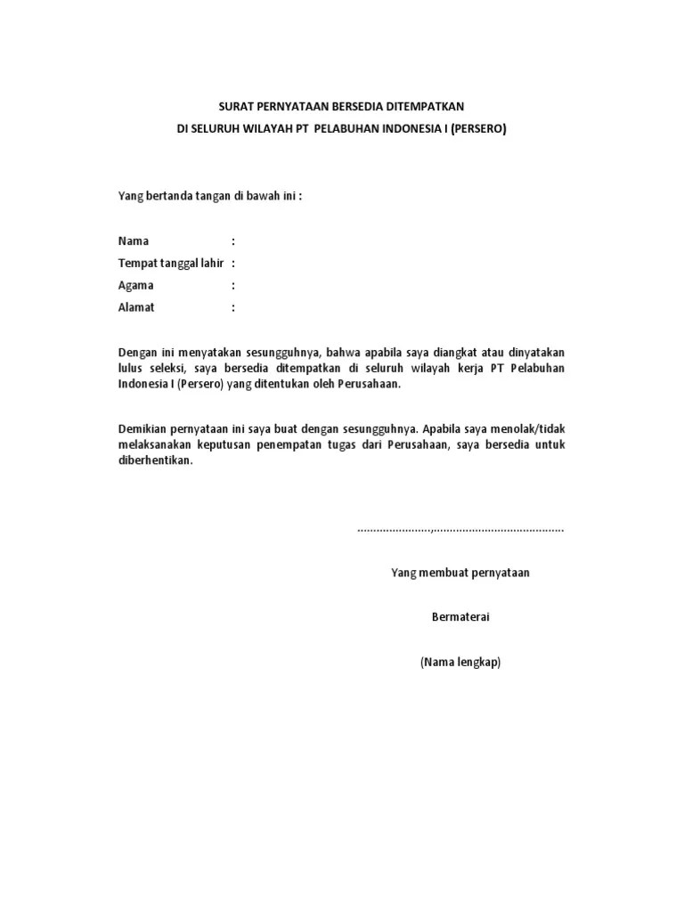 Bersedia ditempatkan di seluruh wilayah nkri. Untuk itu, anda harus siap jika ditugaskan di manapun. Demikian informasi tentang contoh surat pernyataan cpns kemenkumham 2019. Untuk contoh format surat pernyataan bermaterai, surat keterangan, surat permohonan, surat lamaran, surat penawaran, dan surat menyurat demikian ulasan tentang contoh surat pernyataan bersedia ditempatkan dimana saja. Bersedia mengganti biaya jika mengundurkan.